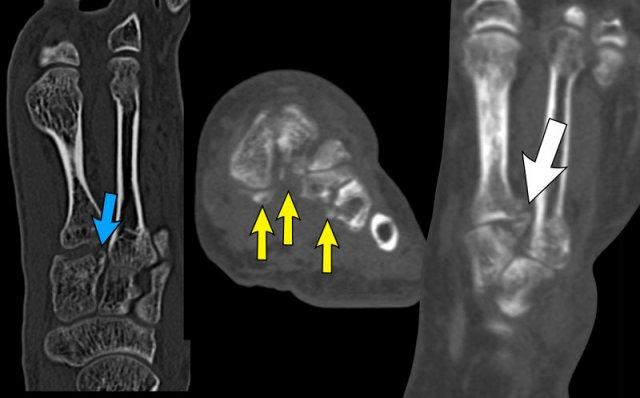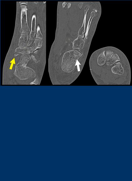 Trong trường hợp này, có sự lật ngoài kèm giãn cách ở phía khớp sên-thuyền với avulsion cực trong của xương thuyền (mũi tên vàng) và lực nén ở phía khớp gót-hộp dẫn đến gãy xương kiểu kẹp hạt (mũi tên trắng).