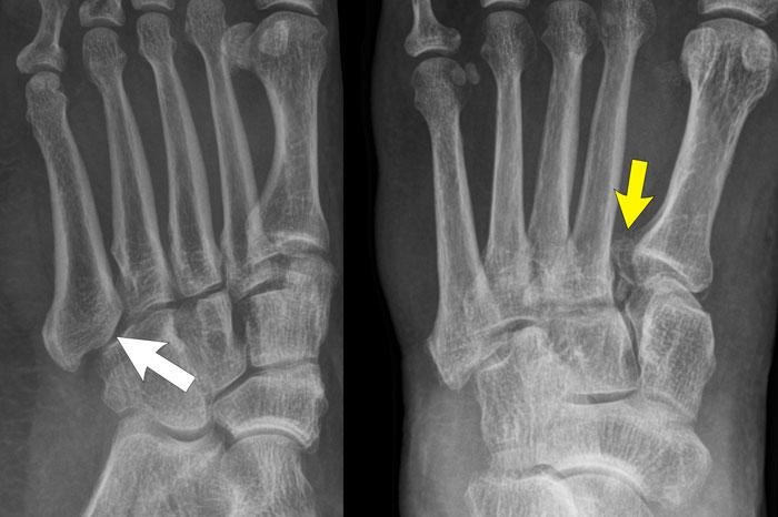 - Khoảng cách lớn giữa nền xương bàn chân 1 và xương bàn chân 2 (mũi tên vàng).