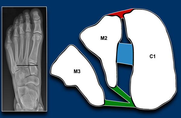 Phức hợp dây chằng Lisfranc chạy giữa xương chêm trong (C1) và nền xương bàn chân thứ 2 và thứ 3.
