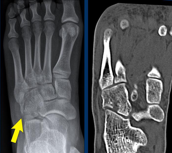 - Bán trật khớp giữa xương hộp và nền xương đốt bàn chân thứ 5 (mũi tên trắng).