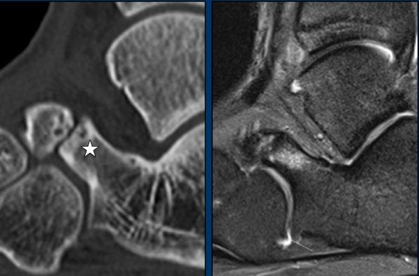 Trên CT, chúng ta thấy sự hợp nhất giữa xương gót và xương thuyền.