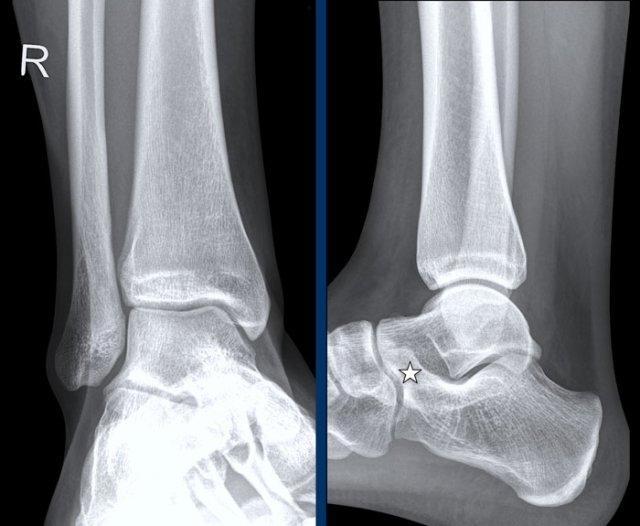 Trong trường hợp này, phát hiện rõ ràng nhất là gãy mắt cá sau.
