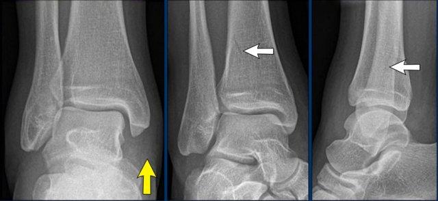 Đây không phải là gãy xương do giật hay kéo, mà là gãy xương do đẩy. - Có thể có một avulsion của mắt cá ngoài (mũi tên trắng), nhưng điều đó chưa chắc chắn.