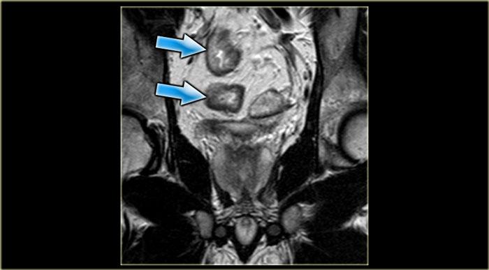 Cần có ảnh định vị theo ba hướng để căn chỉnh các chuỗi xung T2 theo mặt phẳng axial và coronal song song với ống hậu môn.