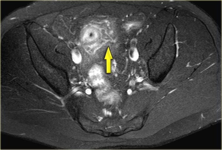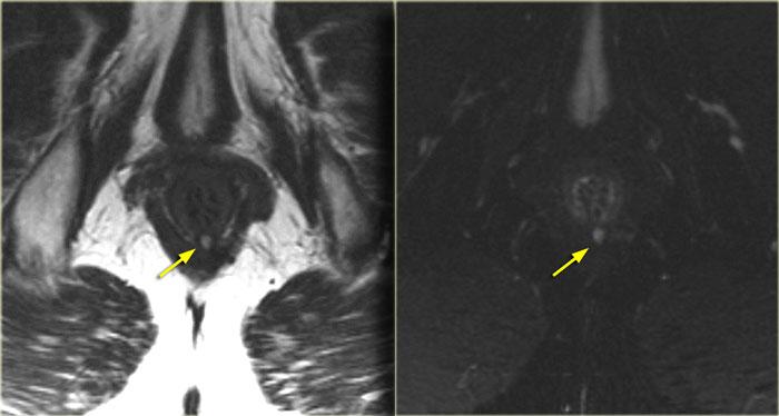 Bên trái là hình ảnh cắt ngang chuỗi xung T2W xóa mỡ của một đường rò xuyên cơ thắt với lỗ mở niêm mạc ở vị trí 11 giờ.