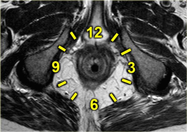 Sơ đồ này tương ứng với hướng của các hình ảnh MR axial vùng quanh hậu môn.