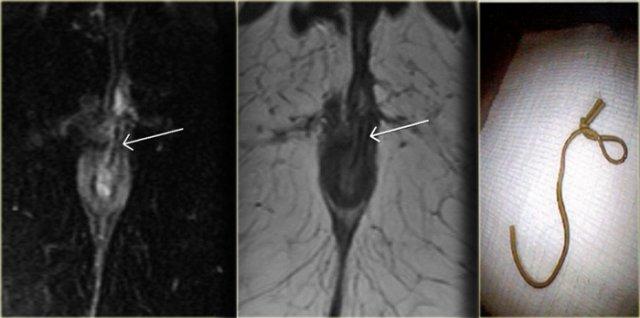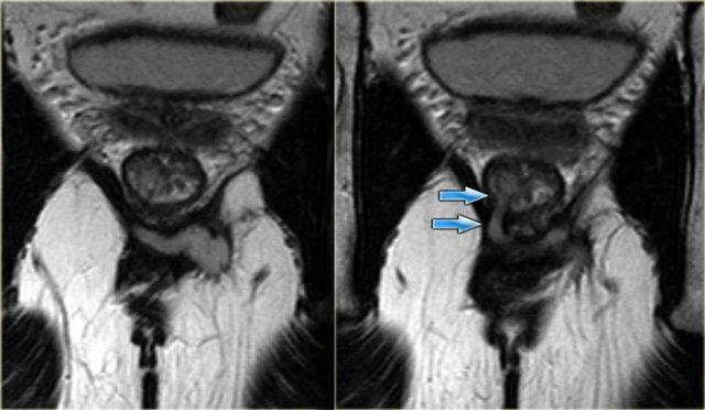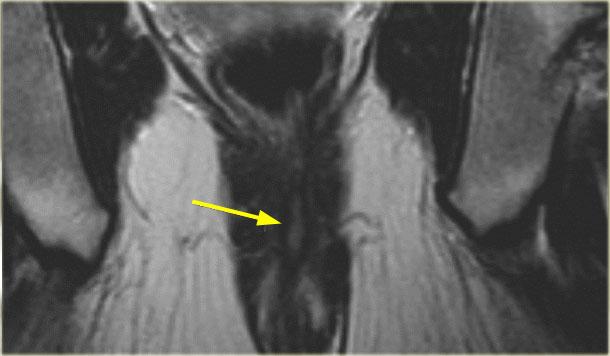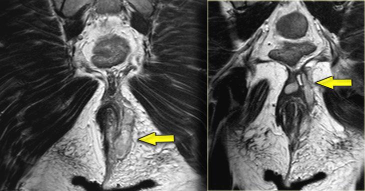 Bên trái là hình ảnh coronal chuỗi xung T2W của một ổ áp xe nhỏ trong hố ngồi-hậu môn trái, đường rò chạy xuyên qua cơ nâng hậu môn.