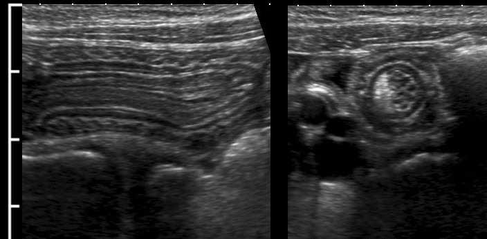Đây là hình ảnh siêu âm của một trẻ 2 tuổi bị lồng ruột hồi manh tràng từng đợt, được khám trong khoảng thời gian giữa các cơn.