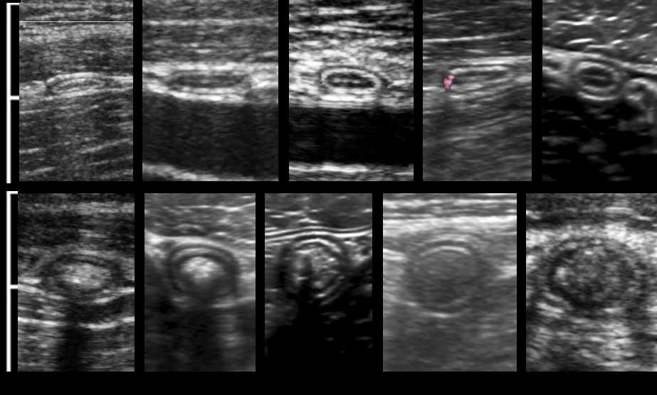 Đây là hình ảnh ruột thừa bình thường khi bị ép trong mười bệnh nhân khác nhau với đường kính AP dao động từ 2-10 mm (Lưu ý cùng một thang đo cm).