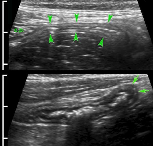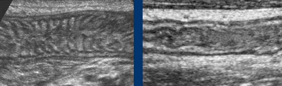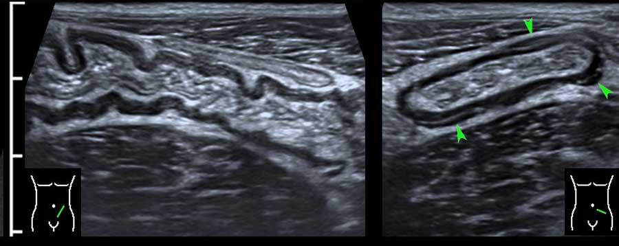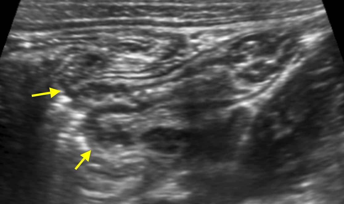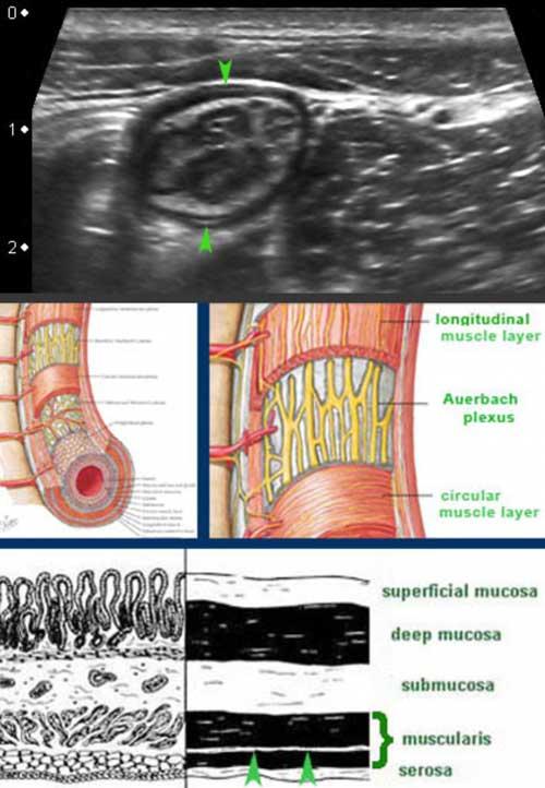 Lớp mỏng này (đầu mũi tên) tăng âm trên siêu âm và có thể thấy ở ruột non của bệnh nhân gầy.