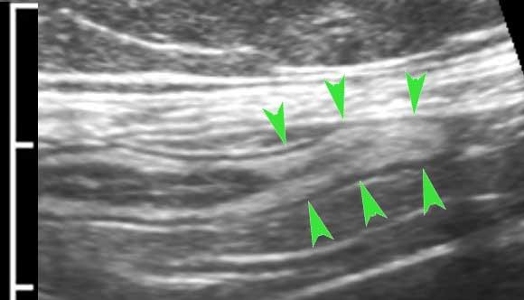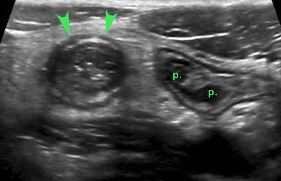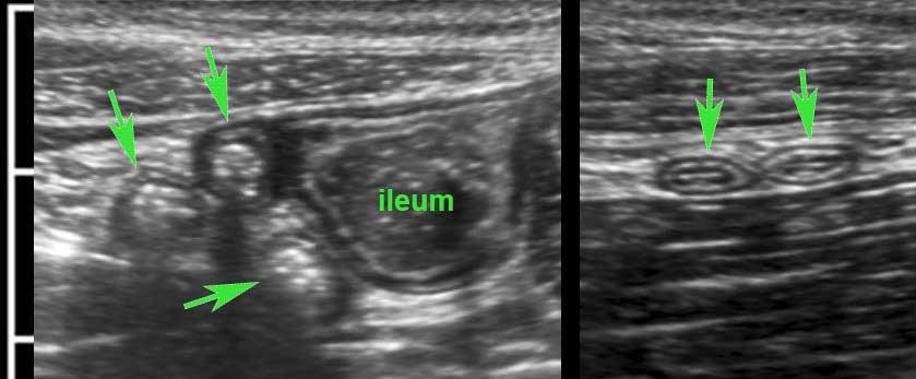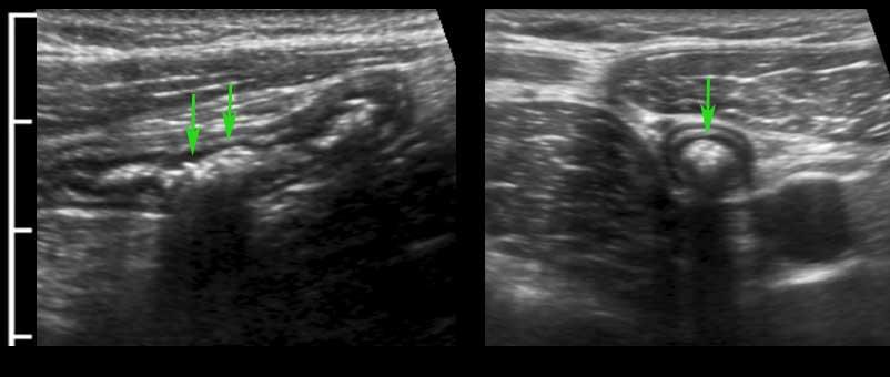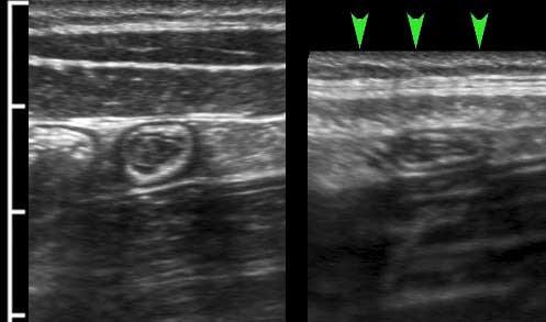 Nếu nằm ở tư thế cong, các đoạn riêng lẻ (mũi tên) nằm gần nhau, trái ngược với ruột thừa bị viêm trở nên cứng hơn và giãn ra ở một mức độ nhất định.