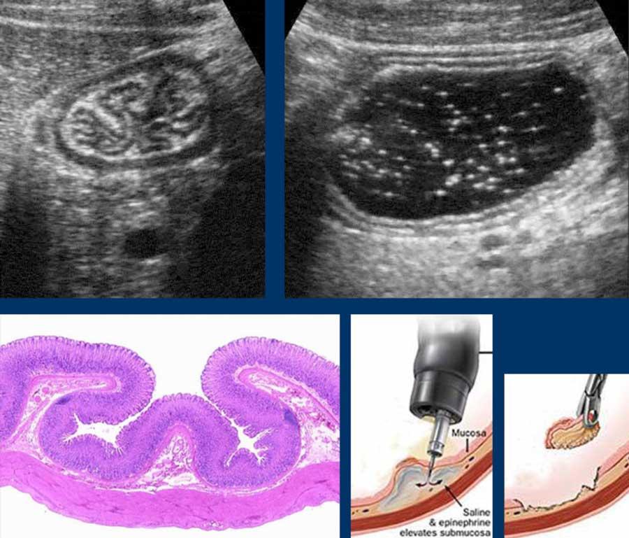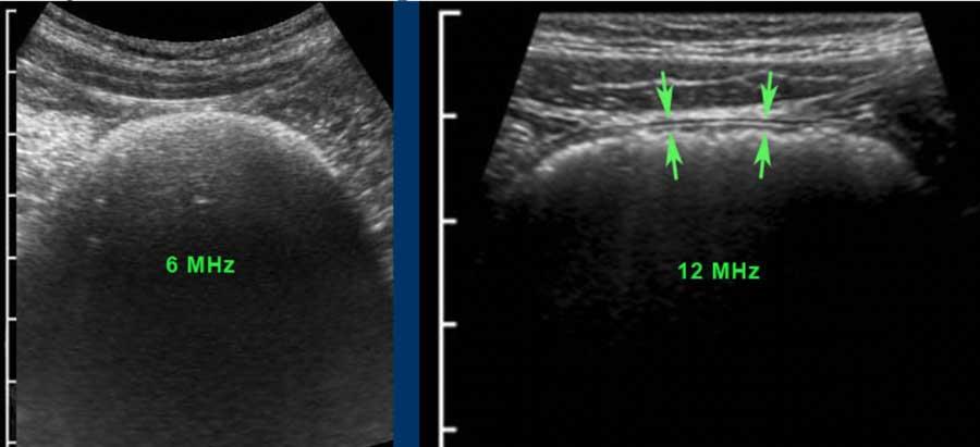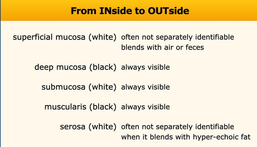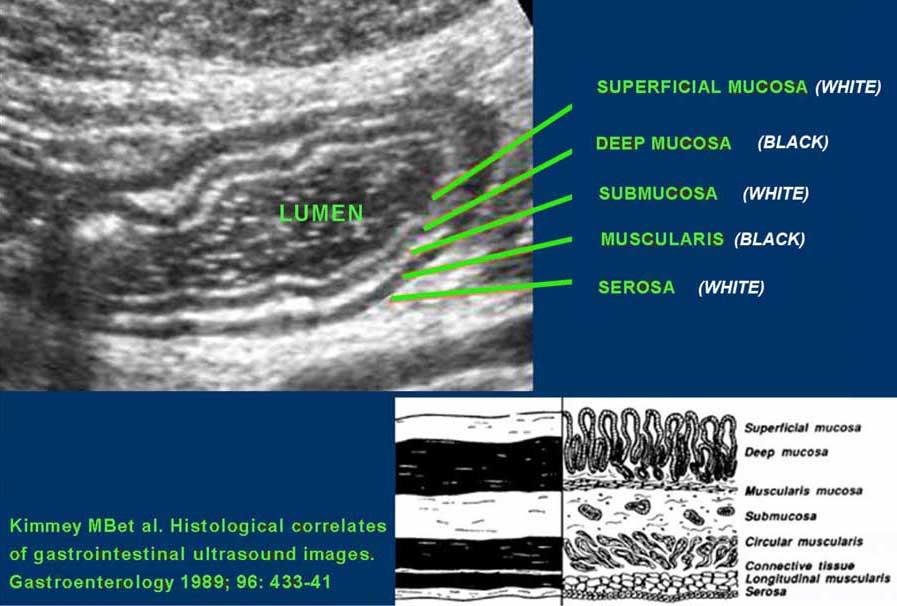 Khi sử dụng đầu dò tần số cao, ba lớp giữa, bao gồm lớp niêm mạc sâu, lớp dưới niêm mạc và lớp cơ (đen-trắng-đen) luôn luôn hiển thị rõ ràng.
