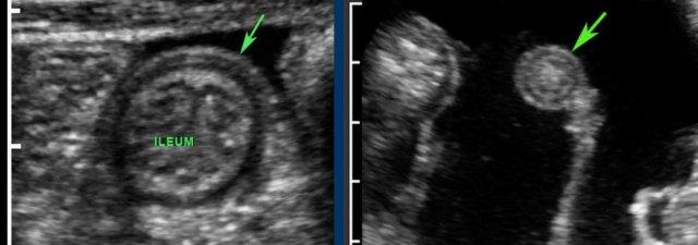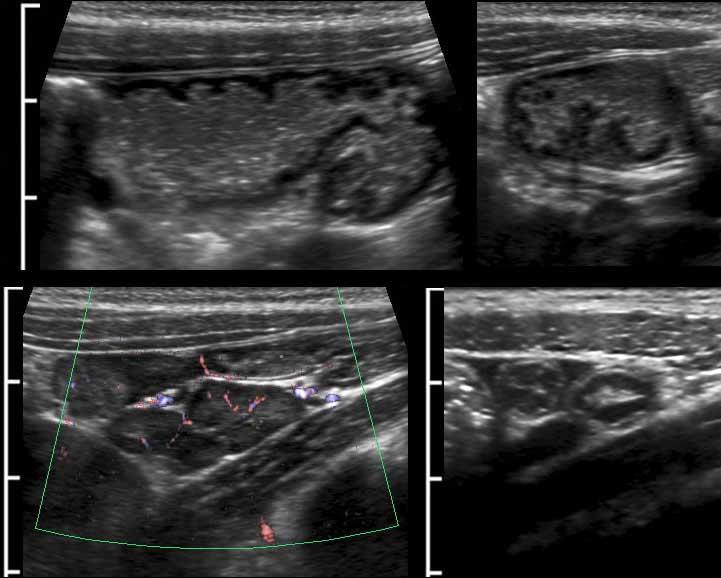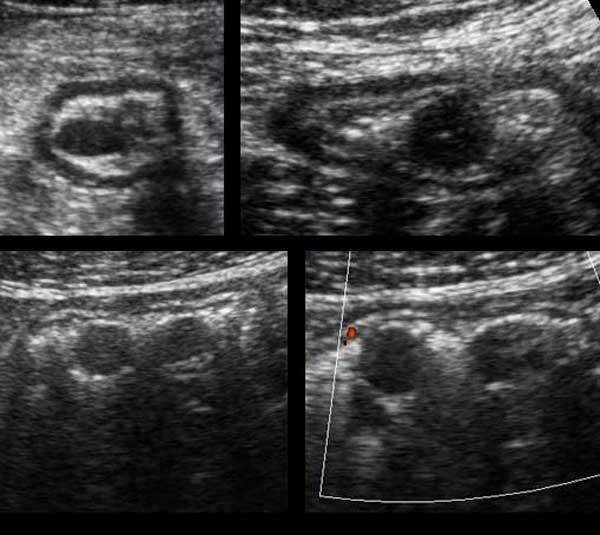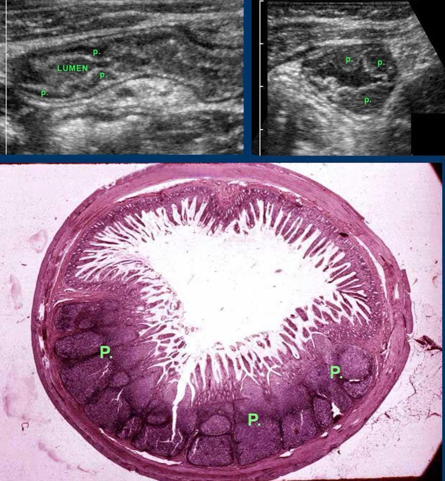 Đây là hình ảnh của hồi tràng tận cùng ở ba trẻ em và người trẻ tuổi khác nhau với các mảng Peyer lớn biểu hiện dưới dạng dày lớp niêm mạc sâu không đối xứng, giảm âm.
