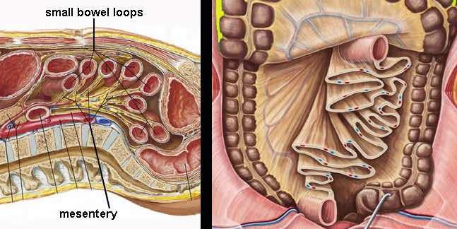 Ruột non được gắn vào mạc treo ruột, được gấp lại như hình chiếc quạt.