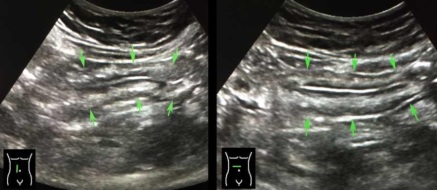 Nếu có dịch trong ổ phúc mạc, lớp thanh mạc tăng âm (mũi tên) có thể được nhận diện riêng biệt, như trong các quai hồi tràng này.