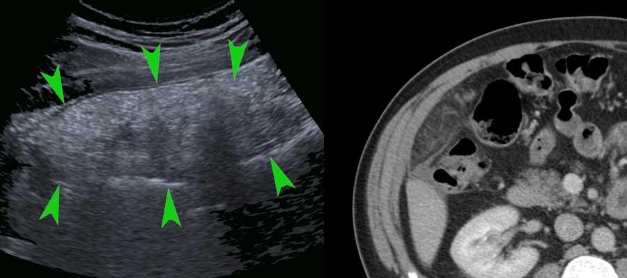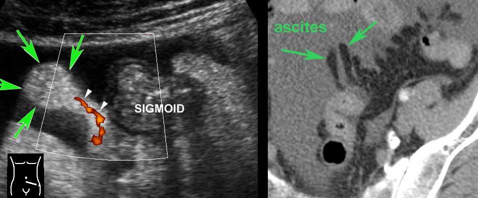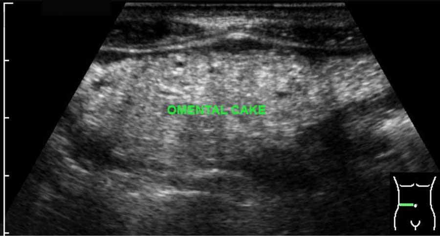Siêu âm cũng có thể hiển thị mạc nối (đầu mũi tên) trong nhồi máu mạc nối khu trú, trong đó mạc nối bị phù nề do nhồi máu xuất huyết tĩnh mạch.