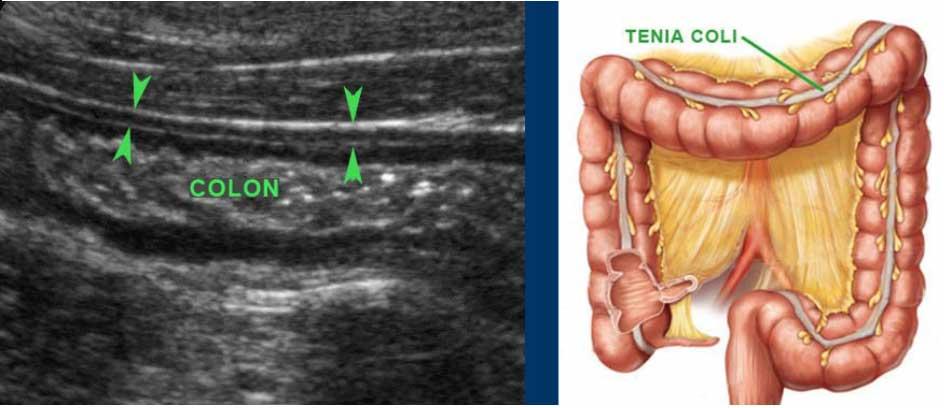 Lớp cơ dọc chỉ giới hạn ở ba dải định hướng dọc, được gọi là dải cơ dọc kết tràng (teniae coli). Trong đại tràng rỗng, xẹp ở những bệnh nhân gầy, ba dải cơ dọc này (đầu mũi tên) thường có thể được xác định bằng siêu âm như một vùng dày lên cục bộ của lớp cơ, tách biệt với lớp cơ vòng bởi một đường tăng âm mỏng.