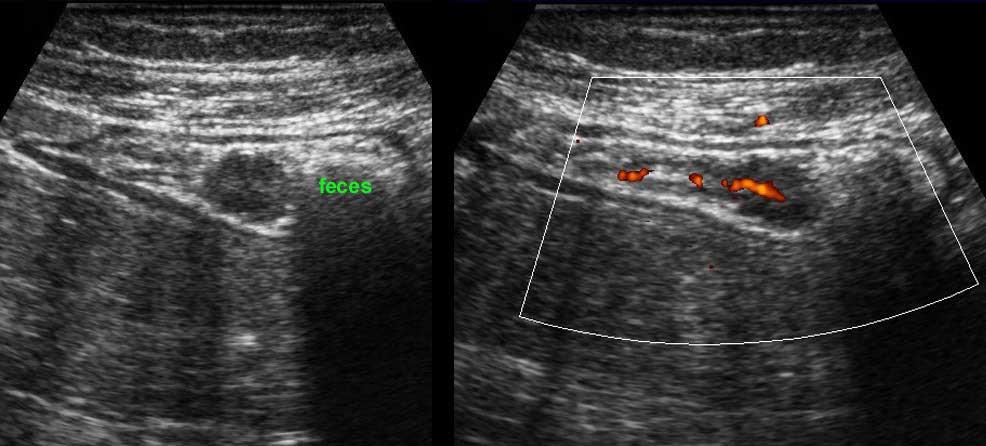 Nó không thể nhận diện riêng biệt khi hòa lẫn với phân tăng âm, như trong hình ảnh siêu âm đại tràng này.