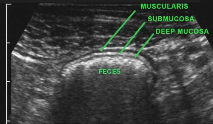 Ở bệnh nhân này với tình trạng ứ phân nặng, cấu trúc thành ba lớp chỉ có thể được nhận diện bằng đầu dò 12 MHz.