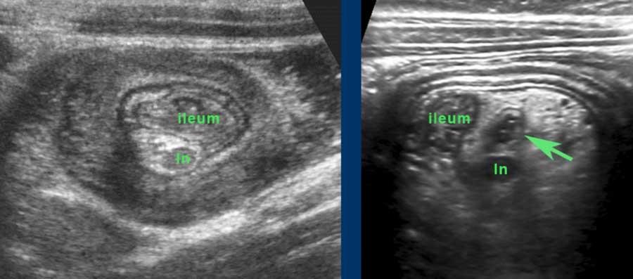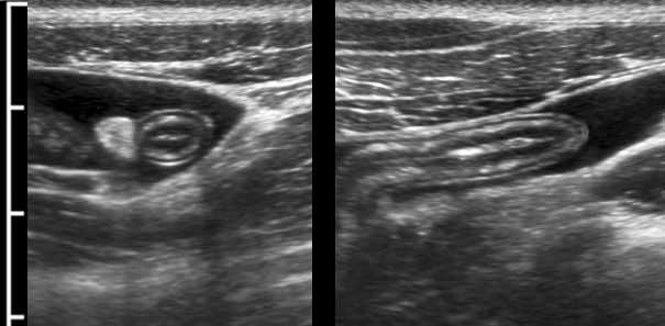 Hình ảnh siêu âm kinh điển của lồng ruột hồi-manh tràng ở hai trẻ khác nhau.