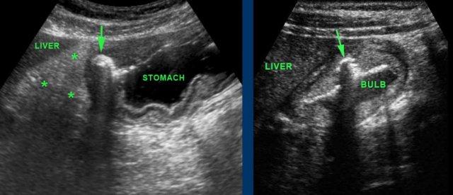 Hình bên phải cho thấy một ổ loét (mũi tên) ở thành bụng của hành tá tràng chứa đầy dịch.