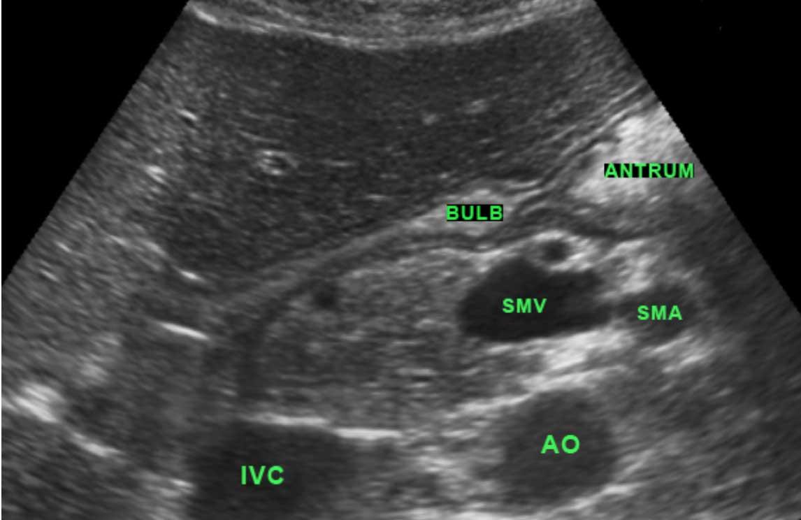 Hang vị và hành tá tràng là những phần của dạ dày được xác định rõ nhất bằng siêu âm.