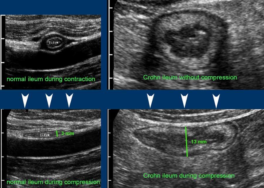 Đo độ dày thành ruột bằng siêu âm theo cách này có tính tái lập và tương đương với những gì các phẫu thuật viên thực hiện bằng ngón tay trong quá trình mở bụng để xác định xem ruột non có bất thường hay không.