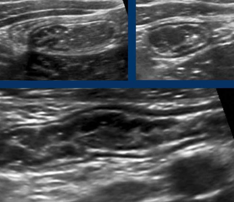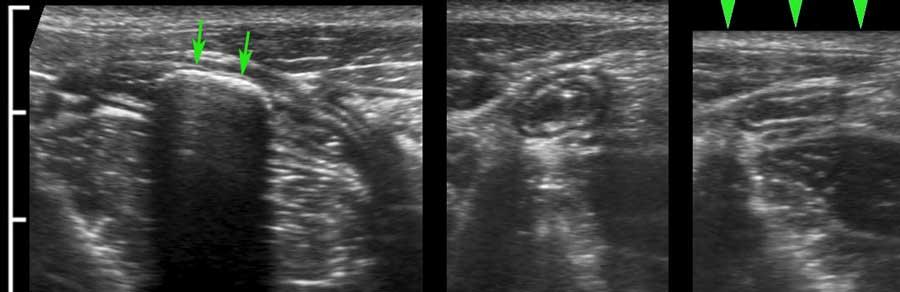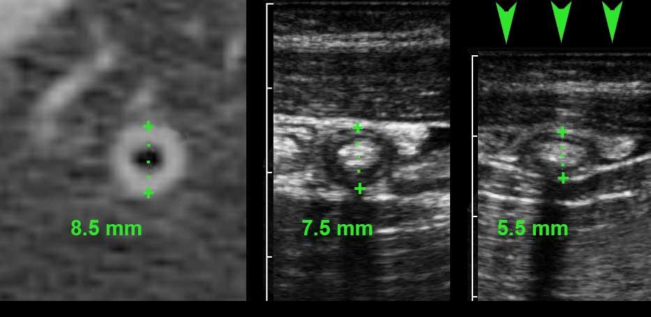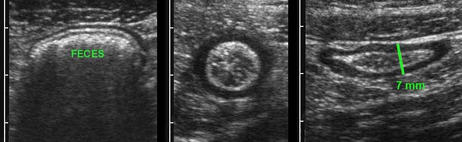 Hình ảnh ở bảng giữa là siêu âm của một ruột thừa bình thường tương đương ở một bệnh nhân khác với kích thước 7,5 mm, bảng bên phải cho thấy ruột thừa đó trong quá trình ép (5,5 mm).