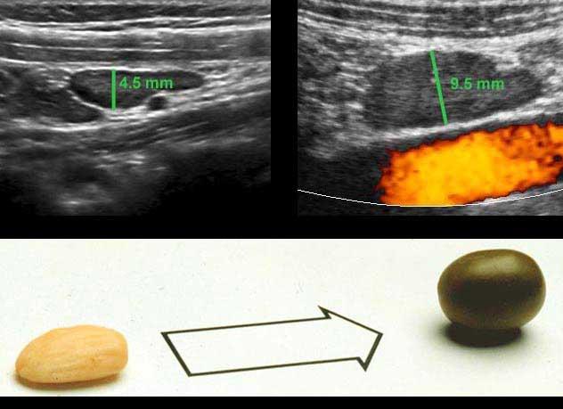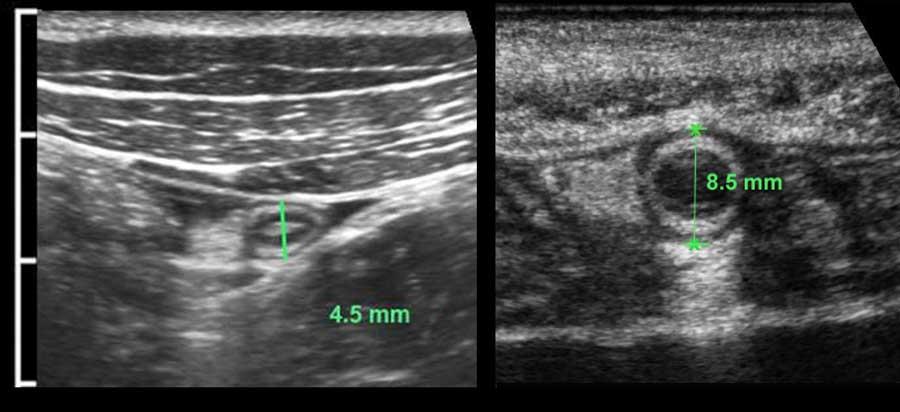 Được đo như vậy, đường kính của ruột thừa bình thường này (trái) là 4,5 mm và của ruột thừa viêm này (phải) là 8,5 mm.