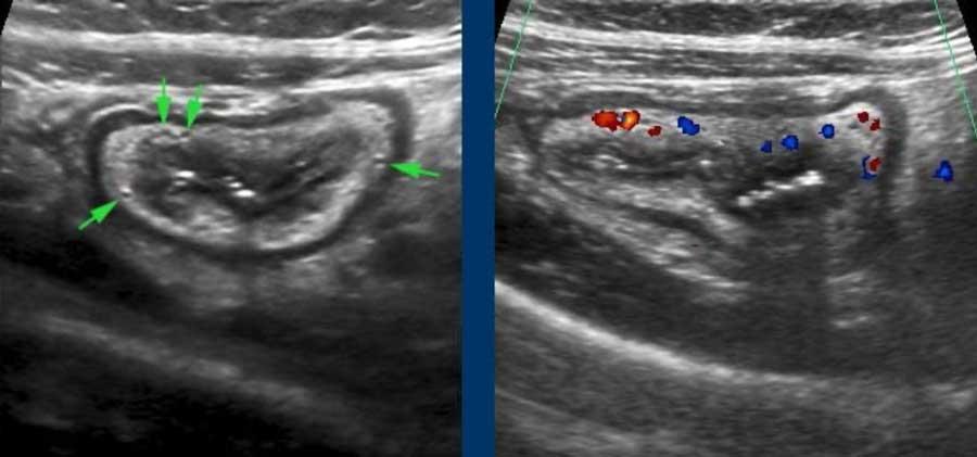 Ở bệnh nhân viêm loét đại tràng này, các mạch máu nổi bật (mũi tên) trong lớp dưới niêm mạc được hiển thị và xác nhận bằng Doppler màu ở hình bên phải.