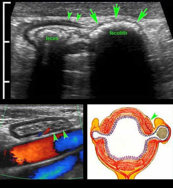 Chúng biểu hiện là các cấu trúc phản âm sáng với bóng cản âm ở bờ ngoài của đại tràng.