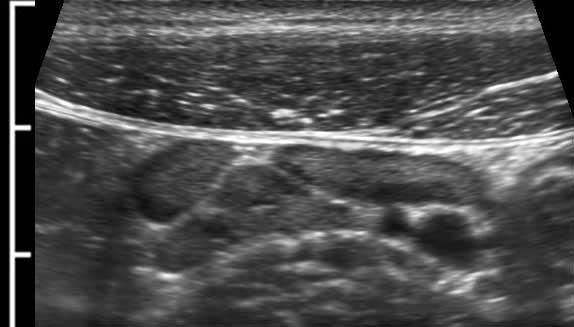 Trong mạc treo, siêu âm cho thấy một hạch bạch huyết mạc treo (hbh) phóng đại ở cả hai.