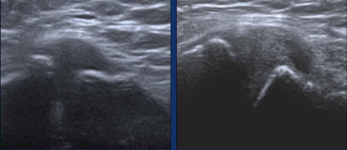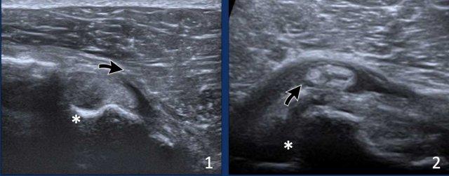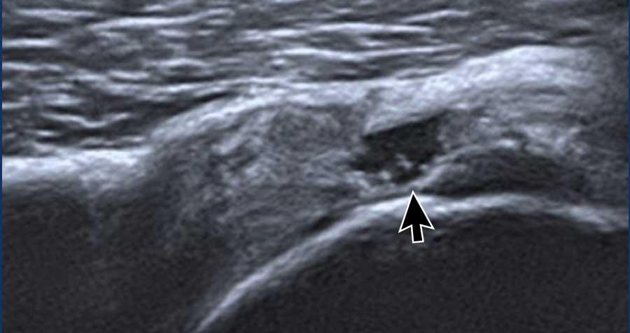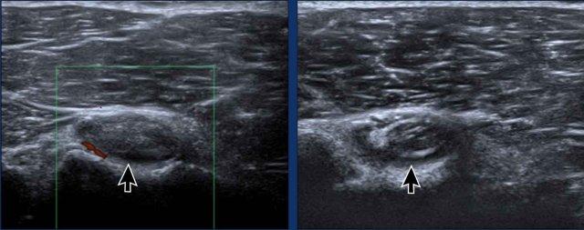 hầu như không thể phân biệt được bằng siêu âm (mũi tên).