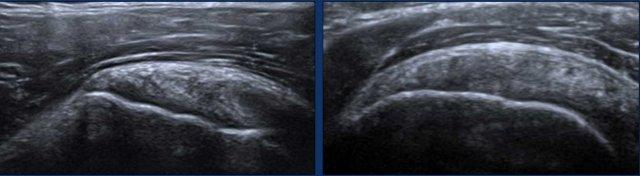 Cần lưu ý rằng hiện tượng dị hướng cũng có thể ảnh hưởng đến các cấu trúc khác, chẳng hạn như gân cơ dưới vai trong hình ảnh này, tương tự cũng xuất hiện giảm âm do hiện tượng nhiễu ảnh này.