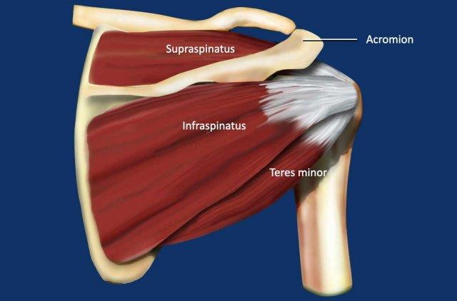 Hình ảnh mặt sau của vai làm nổi bật các cơ trên gai, cơ dưới gai và cơ tròn bé cùng các gân liên quan của chúng.