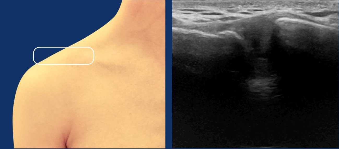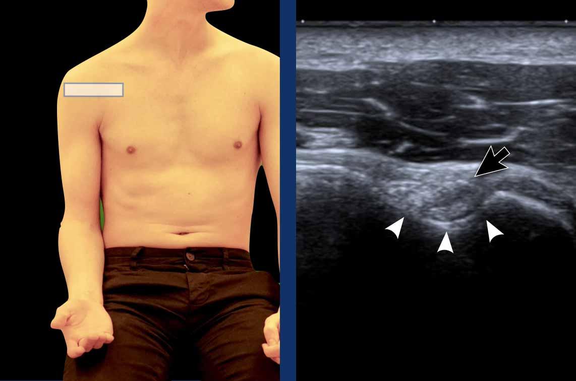 Khớp cùng vai đòn có thể dễ dàng xác định bằng cách sờ nắn phần lồi xương và sau đó đặt đầu dò lên trên đó.