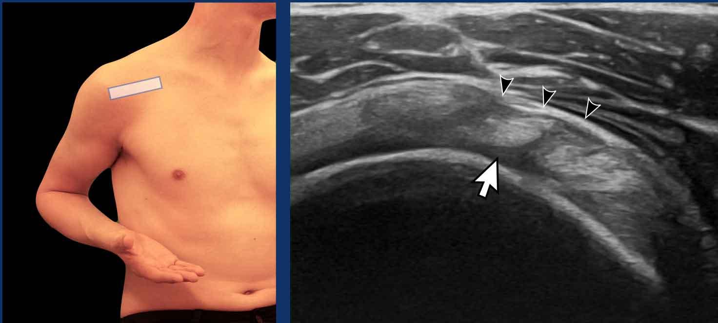 Đầu dò tuyến tính độ phân giải cao (≥10 MHz) thường được sử dụng để siêu âm khớp vai. Đôi khi, đầu dò cong (3,5 MHz) được sử dụng để cung cấp góc nhìn rộng hơn về khớp ổ chảo – cánh tay.