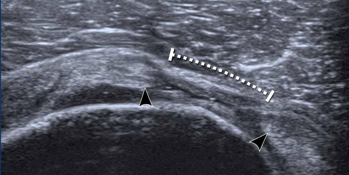Ở tư thế này, gân cơ nhị đầu dài (LHB) xuất hiện như một cấu trúc tròn với cấu trúc âm dạng sợi (mũi tên đen) nằm trong rãnh gian củ (đầu mũi tên trắng).