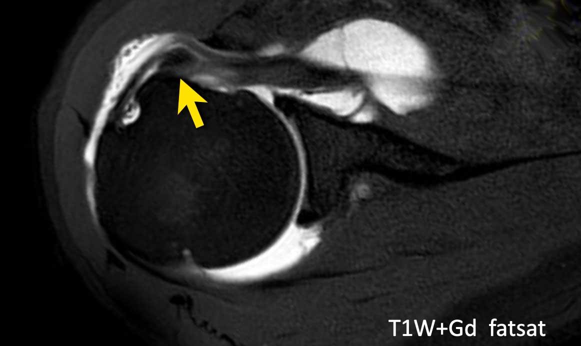 Chụp cộng hưởng từ khớp với hình ảnh trục T1 có ức chế mỡ: Gân cơ nhị đầu bị di lệch về phía trong gân cơ dưới vai, như được chỉ ra bởi mũi tên.