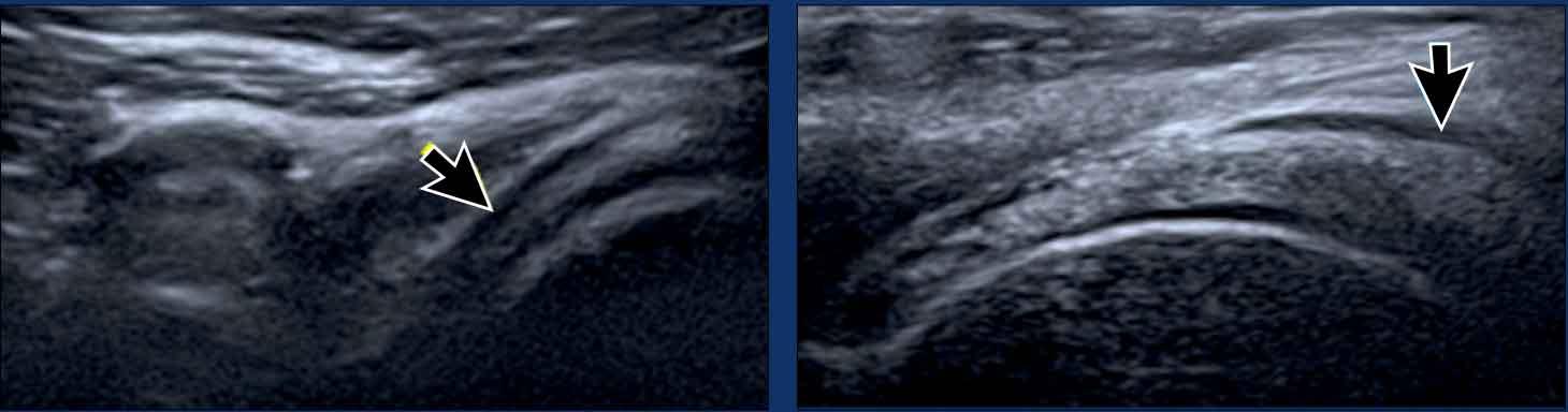 Hai ví dụ về gân đầu dài cơ nhị đầu bị dày lên.