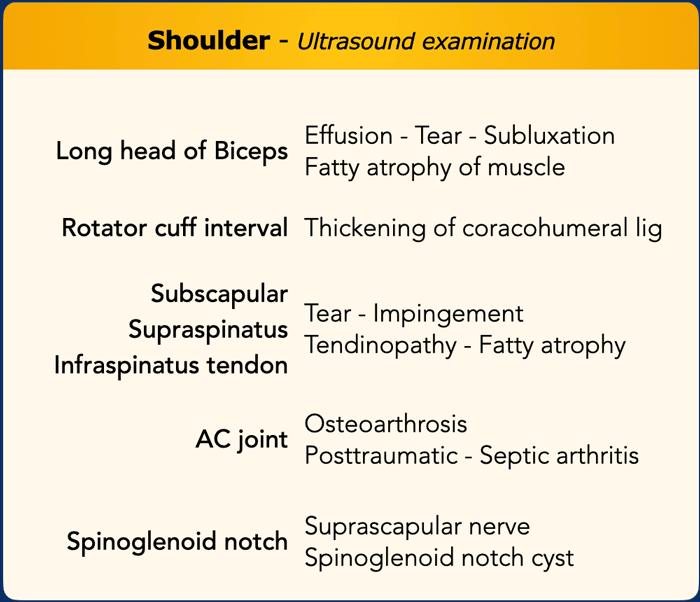 Việc kiểm tra có thể được mở rộng để bao gồm khớp cùng vai-đòn (AC), khuyết gai-ổ chảo, sụn viền sau và khớp ổ chảo-cánh tay.