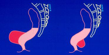 Hình ảnh bình thường khi nghỉ (bên trái); trong khi đại tiện có túi sa trực tràng bị đẩy xuống dưới bởi thoát vị ruột non.