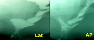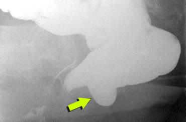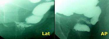 TRÁI: Nghi ngờ bệnh lý do khoảng cách lớn giữa trực tràng và âm đạo. Bệnh nhân chưa được uống thuốc cản quang. PHẢI: Sau khi uống thuốc cản quang barium dạng lỏng, quan sát thấy một thoát vị ruột non vào túi cùng Douglas (enterocele) kích thước lớn.