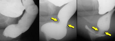 TRÁI: Cơ thắt tăng trương lực (trong khi đại tiện). PHẢI: Hình ảnh ấn lõm của cơ mu-trực tràng tăng trương lực (không giãn trong khi đại tiện).