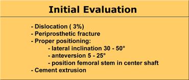 Các phim chụp X-quang sau phẫu thuật ban đầu được thực hiện để tìm kiếm khả năng trật khớp hoặc gãy xương và để xem liệu bộ phận giả có được đặt đúng vị trí hay không.