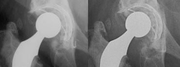 Ở bên trái là một trường hợp khác với tình trạng trật khớp do hậu quả của việc nghiêng chỏm do lỏng khớp.