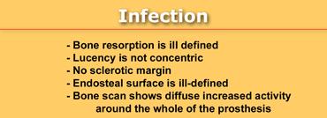 Xạ hình xương bằng đồng vị phóng xạ rất nhạy trong việc phát hiện nhiễm trùng, nhưng không đặc hiệu vì có thể cho thấy các hình ảnh tương tự như những hình ảnh xảy ra trong tình trạng lỏng khớp.