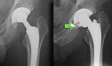 Trường hợp bên trái cho thấy gãy đầu kim loại của cấu phần xương đùi.