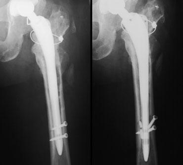 Đôi khi phẫu thuật viên tạo một lỗ kiểm soát có chủ ý trong quá trình phẫu thuật lại để hỗ trợ tháo bỏ thành phần xương đùi đã được đặt trước đó.