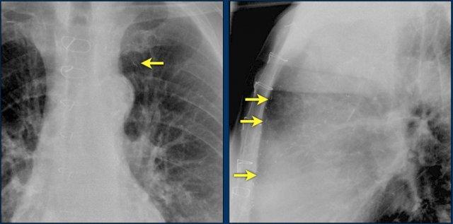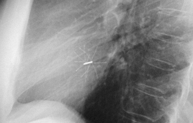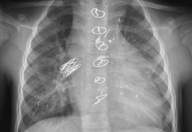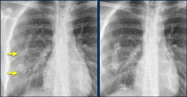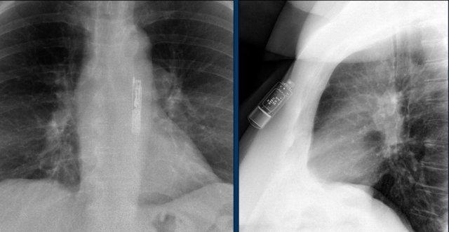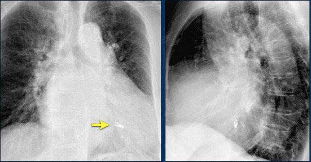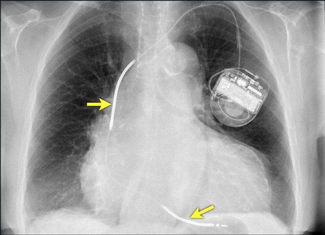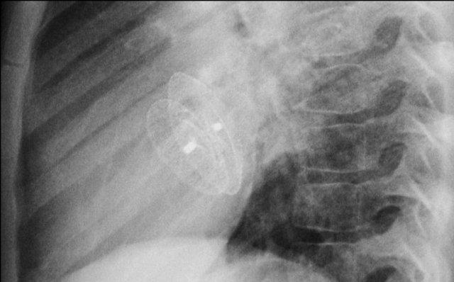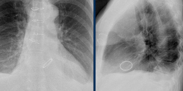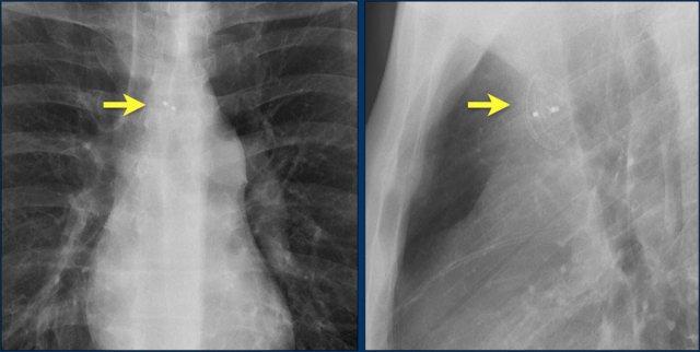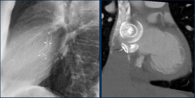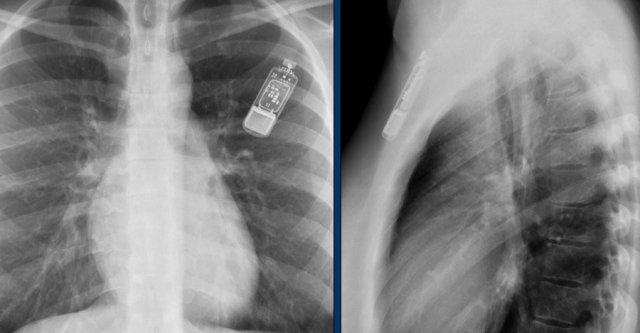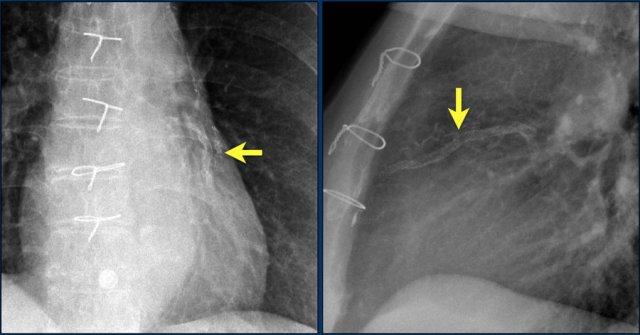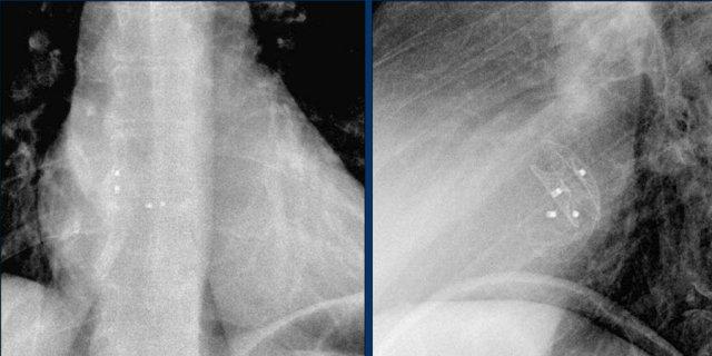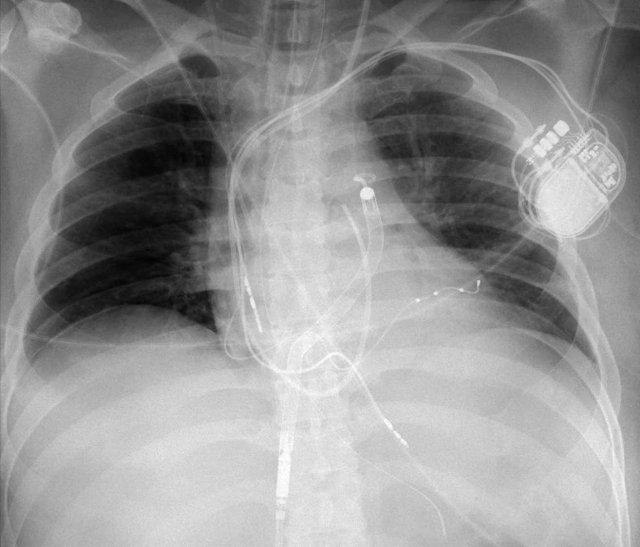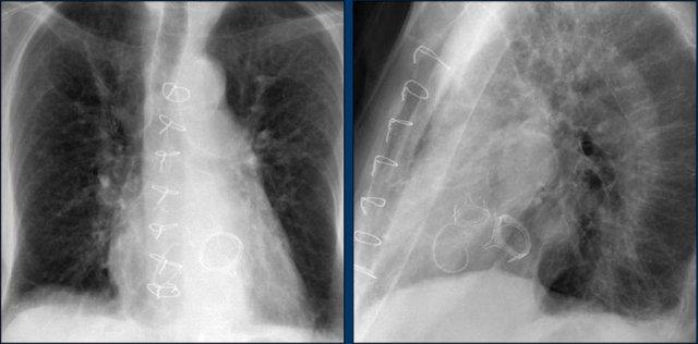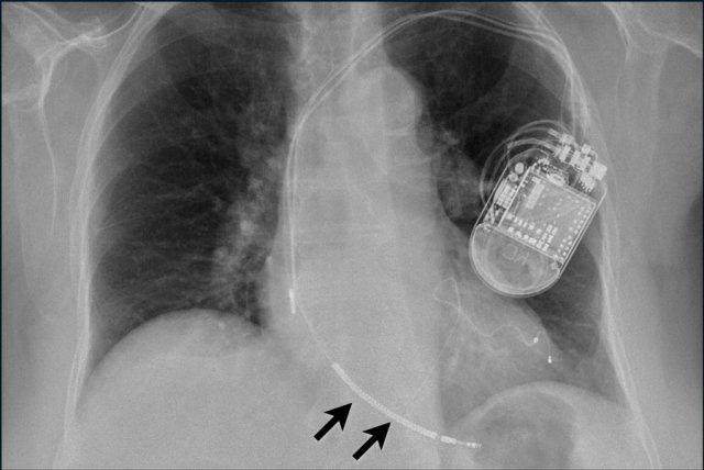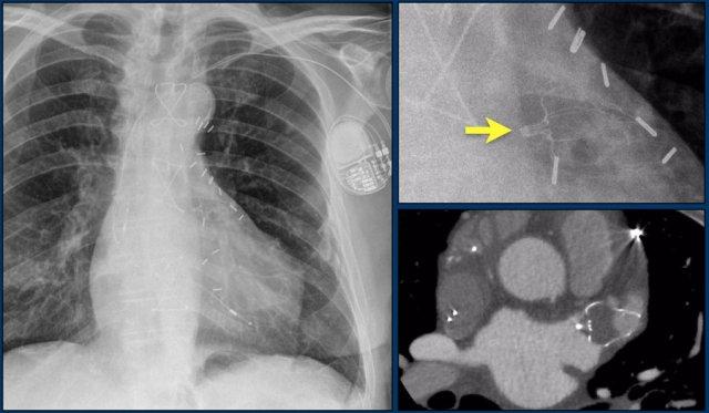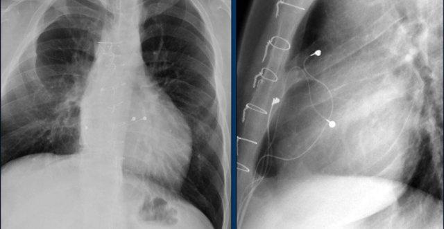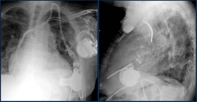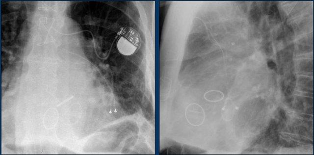 Cũng cần lưu ý sự hiện diện của máy ICD ba điện cực với hai cuộn sốc điện và các clip ghép động mạch vú trong trái (LIMA) từ lần phẫu thuật trước.